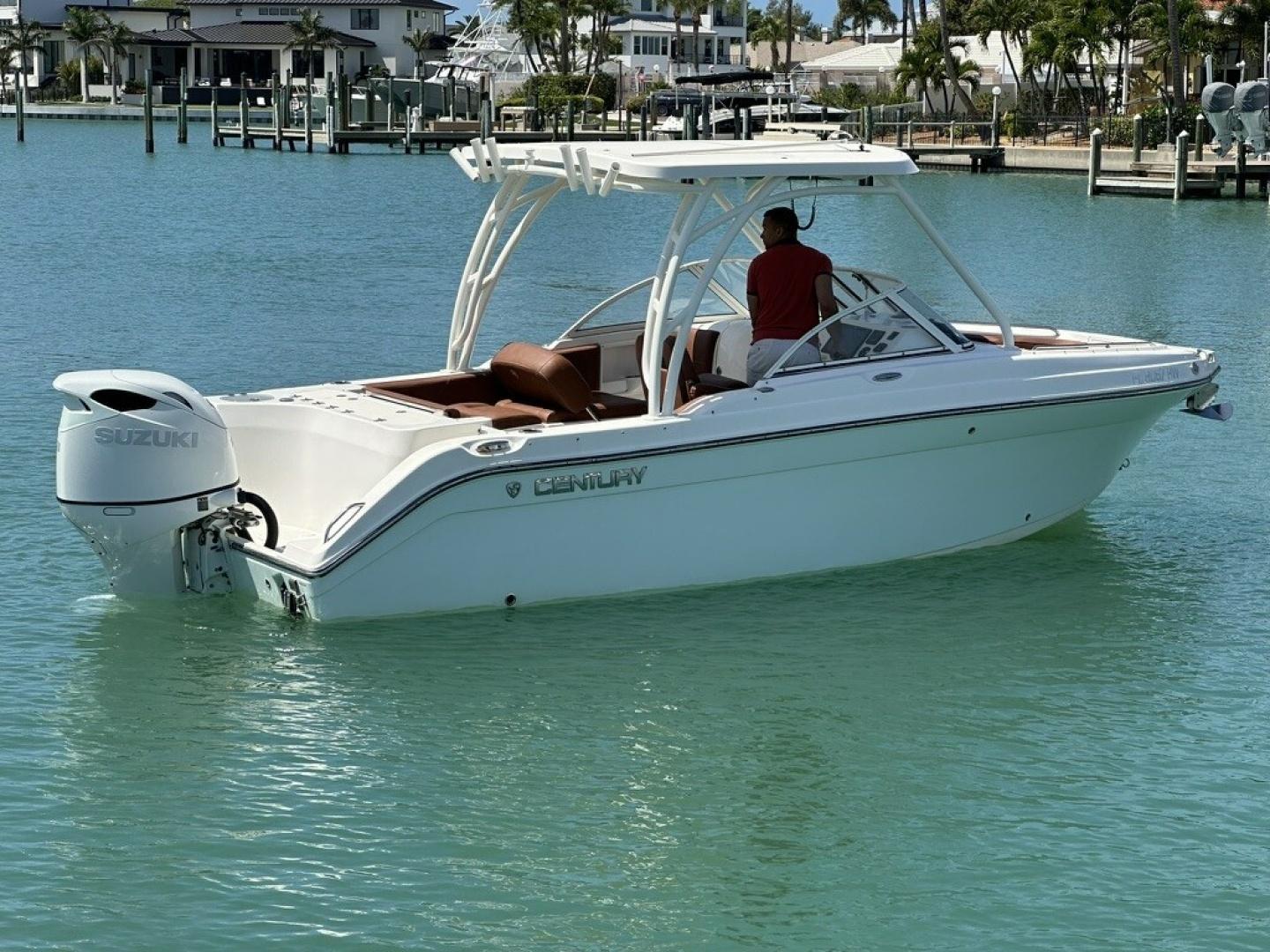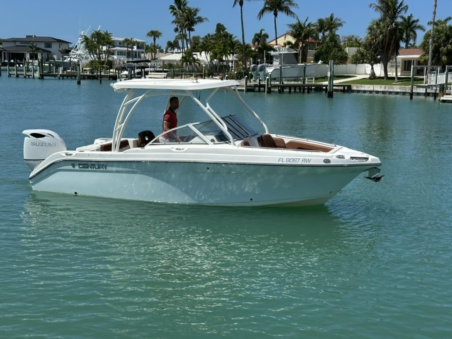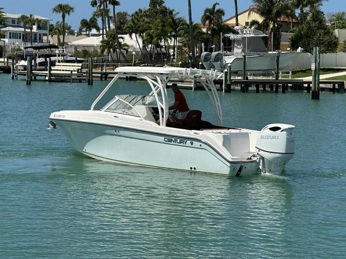 2019 Century Resorter. Suzuki DF 350 Dual Prop w 685Hrs. Custom Tandem Aluminum Gulf Coast Trailer. Loaded with all the goodies.The 24 Resorter reignites the popular Century Boats model of yesteryear – updated with all the latest innovations and technology of today. The cutting-edge dual console design delivers the versatility you demand with amenities, features and performance needed for hardcore fishing trips, day cruising excursions and high-octane family watersports.Dual console design features a large bow seating area that creates an ideal social setting with a removal table, beach-boarding ladder and foldable armrests that create comfortable loungers.Designed for offshore fishing, luxurious day cruising and family-friendly watersports activities.Extra-large optional fiberglass hard-top with misting system creates a comfortable retreat from the elements – and standard freshwater shower and sink prep station keep your day fresh.